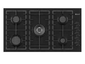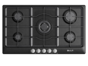 بولم BULM – سطح بلت إن غاز إيطالي 90 سم ستانلس ستيل، 5 شعلات غاز مع شعلة مزدوجة دبل، لون أسود كامل، مفاتيح تحكم أمامية، إشعال ذاتي، دعامات أواني وحامل مقلاة من الحديد الزهر، حساس أمان كامل، أداء عالي للمطابخ الحديثة – موديل B95-901NERO