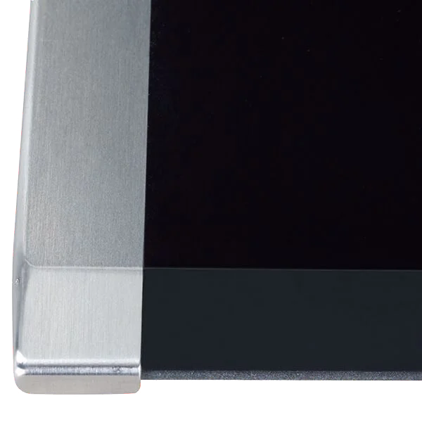 - موقد زجاجي أسود مشطوف الحواف مع حواف جانبية من الفولاذ المقاوم للصدأ