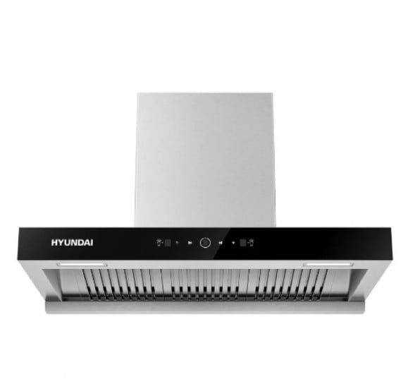 شفاط هيونداي HYUNDAI جداري حرف تي قوة شفط 1200م/3 – تحكم بالاشارة تحكم باللمس زجاج اسود مع واجهة زجاج +استيل فلاتر شرائح بافل مع كوب تجميع الزيوت موتور معدني – HY-03