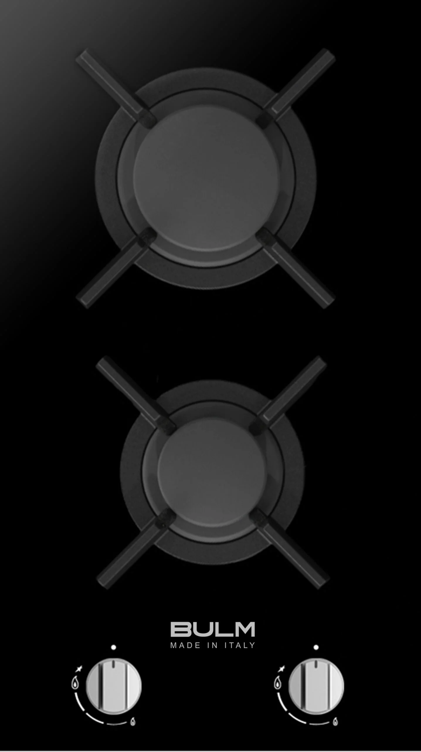 بولم BULM – سطح بلت إن غاز إيطالي 30 سم ستانلس ستيل، 2 شعلات غاز عالية الكفاءة، لون أسود كامل أنيق، تحكم يدوي أمامي سهل الاستخدام، إشعال إلكتروني سريع، دعامات أواني من الحديد المطلي بالزهر لثبات قوي، أنظمة أمان متكاملة صناعة إيطالية – موديل B35-200NERO