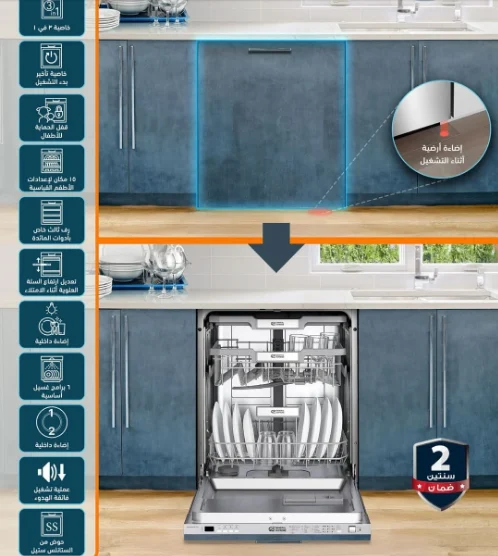 هيونداي – غسالة صحون – غسالة أطباق بلت ان سعة الغسالة 15 مقعد 3 رفوف – 7 برامج غسیل – 2 رشاش ماء سفلي وعلوي – حوامل قابلة للطي – خاصية فتح الباب تلقائي بعد الانتهاء من الغسيل – HY-TDB7AT