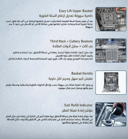 🔹 Easy Lift Upper Basket – خاصية تعديل ارتفاع السلة العلوية بسهولة