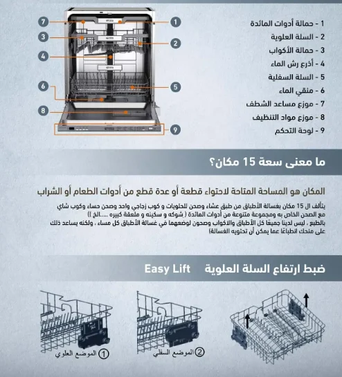 | 5. سريع (Rapid) | غسيل أقصر للأواني المتسخة قليلاً والتي لا تحتاج لتجفيف | A shorter wash for lightly soiled loads that don’t need drying |
