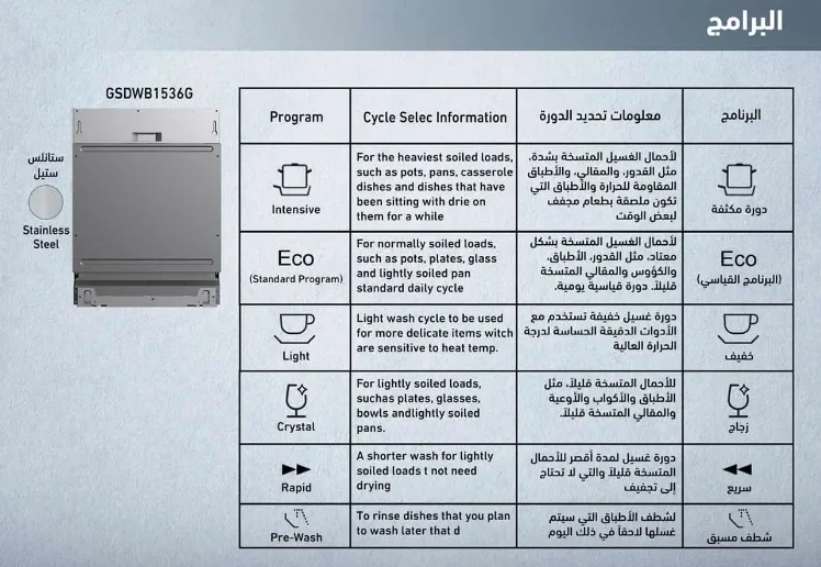 🧼 برامج غسيل الأطباق – موديل GSDWB1536G