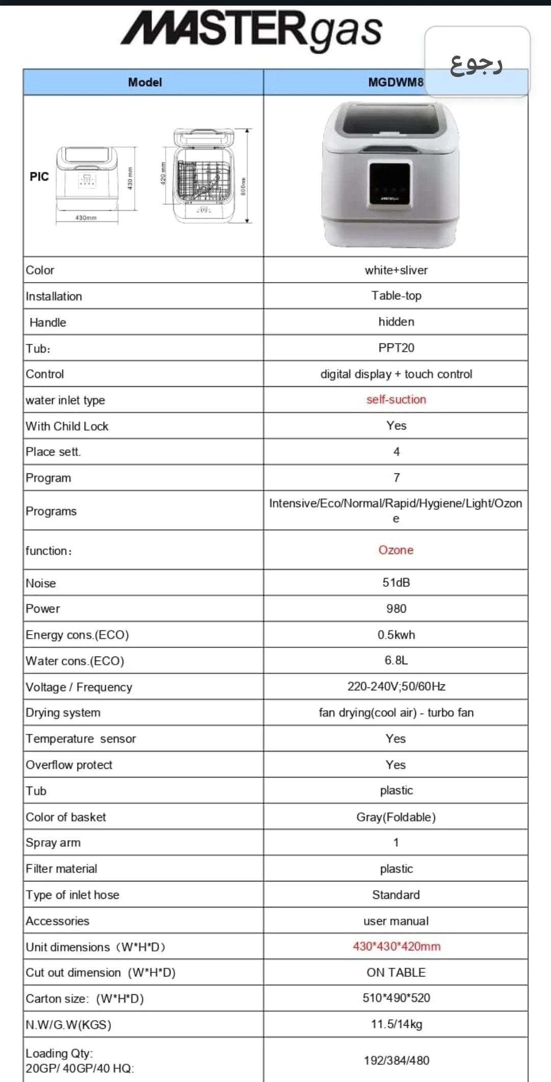 الرئيسية » المتجر » ماستر جاز – غسالة صحون للمنضدة والسطح الرخامي – عدد الأماكن : 4 أماكن عدد البرامج : 7 برنامج المقاس : 43 سم تحكم دقيق يعمل باللمس – خاصية التجفيف للمحتويات للاستخدام المباشر – MGDWM8