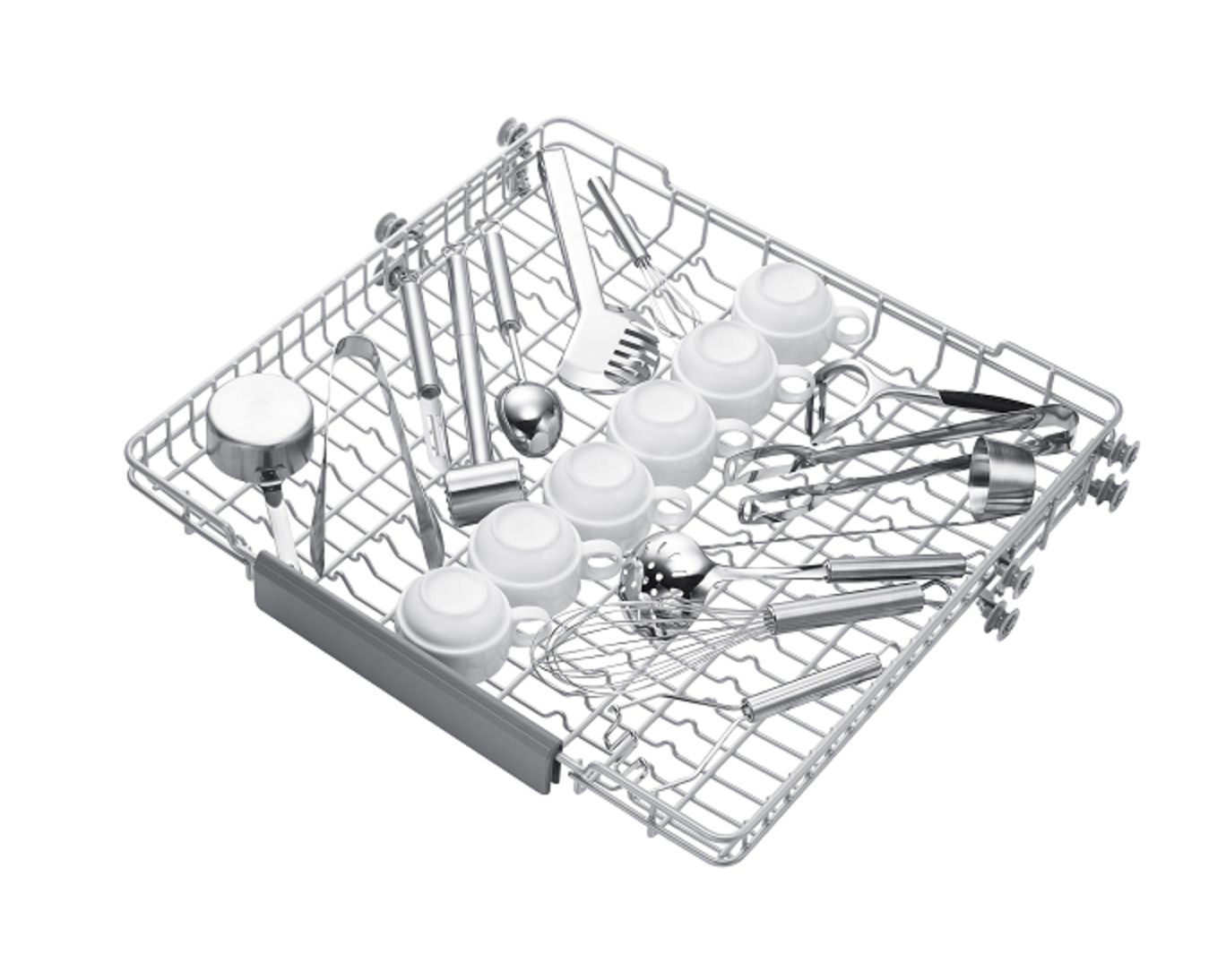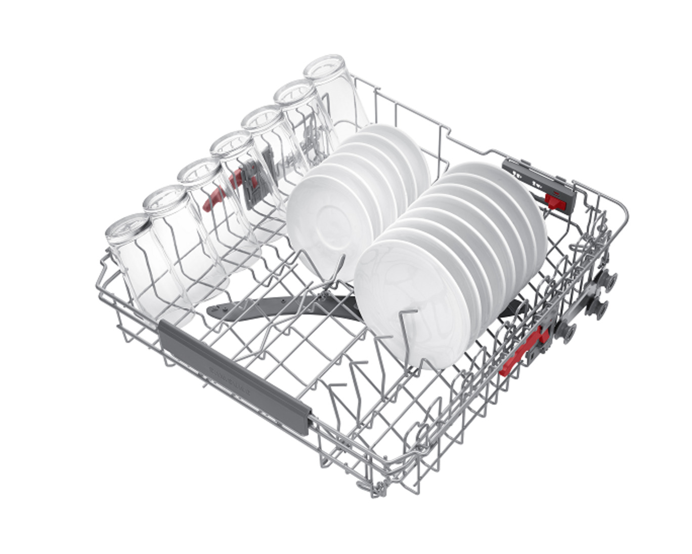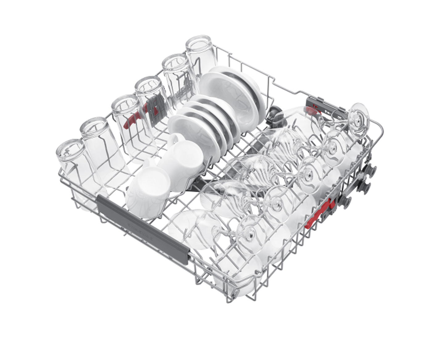 Shows a rack full of dishes, which can be pulled out easily using the dishwasher's Soft Railing system.