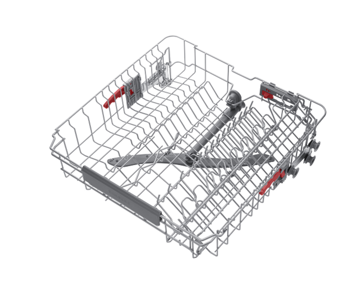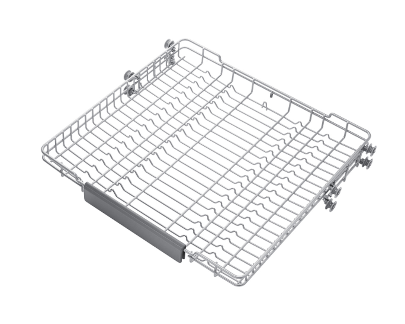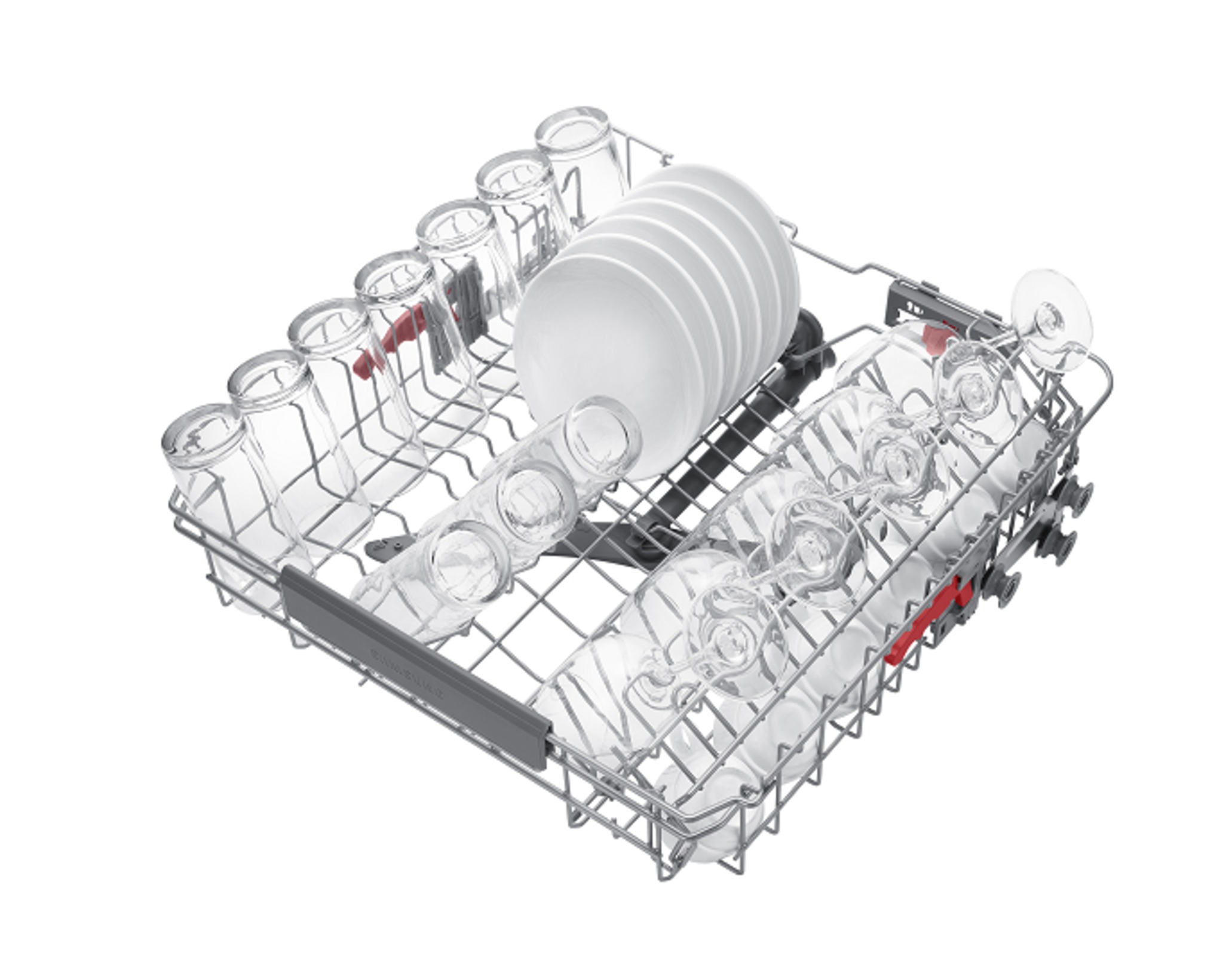 Shows a rack full of dishes, which can be pulled out easily using the dishwasher's Soft Railing system.