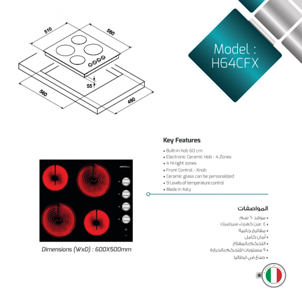 سطح MASTERgas ماستر جاز – بلت ان 60 سم إيطالي – 4 عين كهرباء سيراميك – مفاتيح جانبية للتحكم – صمام أمان كامل – مؤشر ضوئى – سهل التنظيف والتحكم – 9 مستويات للتحكم بالحرارة – H64CFX