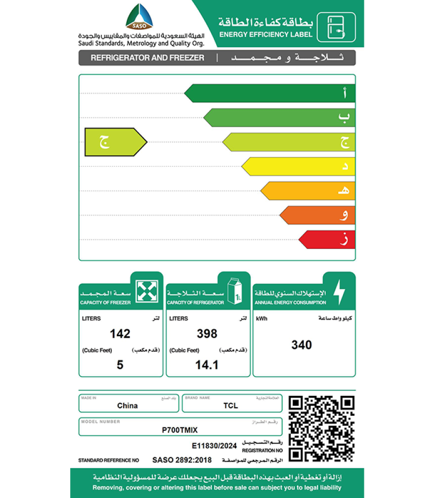 تي سي إل ثلاجة TMF سعة 19 قدم مكعب (538 لترًا) بتقنية العاكس 50/60 – P700TMIX